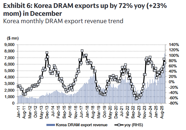 与此同时,韩国12月DRAM出口呈现出强劲的同比增长趋势(同比增长 72%),同样是由于DRAM价格上涨所致。