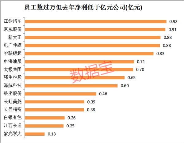 这其中不乏大量的员工数超万人的上市公司,如员工数超7万的石化油服,2018年净利润仅有1.42亿元;员工数3.52万人的海航科技,去年净利润仅有0.6亿元。除海航科技外,员工人数超万人,且去年净利润低于1亿元(净利润为正)的公司还有14家,包括紫光学大、江西长运、白银有色、长盈精密等。