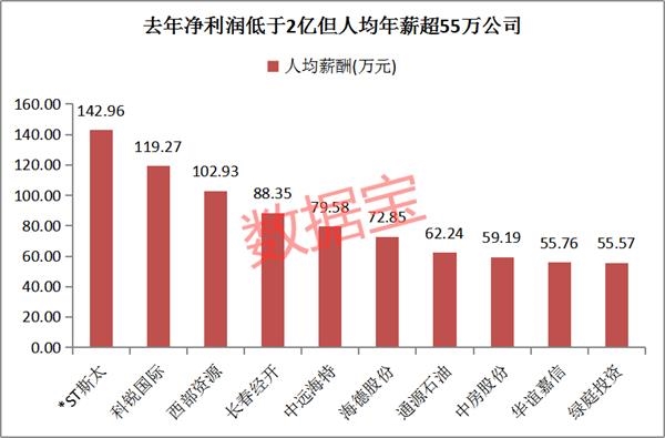 具体来看,上述10公司中有3家去年业绩亏损,包括*ST斯太、中房股份、华谊嘉信。汽车股*ST斯太去年亏损13.08亿元,人均薪酬高达142.96万元,地产股中房股份去年亏损0.42亿元,人均薪酬接近60万。另外,科锐国际、西部资源去年人均薪酬都超过了百万。
