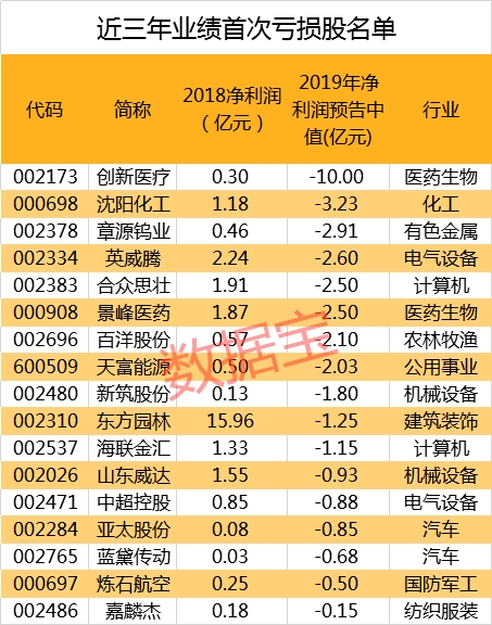 数据宝统计显示,以2019年净利润中值来看,17股近三年来业绩首次亏损。分析发现,17股多为传统行业个股。以2019年度亏损金额来看,创新医疗亏损额达到10亿元,沈阳化工亏损3.23亿元,章源钨业亏损2.91亿元。其中今年亏损额达到1.25亿元的东方园林去年净利润接近16亿,而去年盈利2.24亿元的英腾威今年亏损额也将达到2.6亿元。