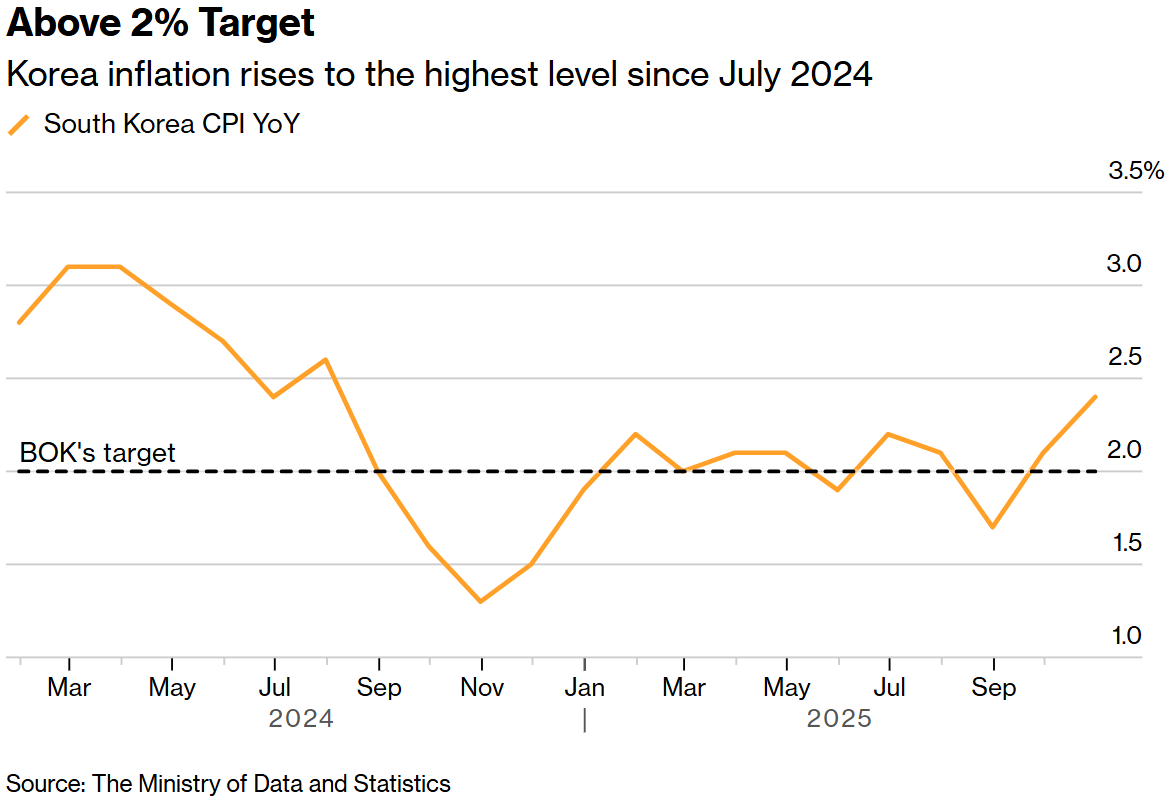 最新的通胀数据出炉之际,韩国央行正处在一个微妙时刻,该行在过去三次会议上均维持基准利率不变。尽管韩国经济可能面临美国关税带来的冲击,但对资产泡沫和与家庭债务相关的金融稳定风险的担忧,使得政策制定者不敢重启去年10月开始的降息周期。