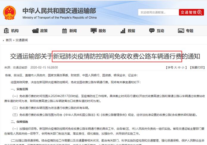 据交通运输部网站2月15日消息,经国务院同意,决定在新冠肺炎疫情防控期间,免收全国收费公路车辆通行费。