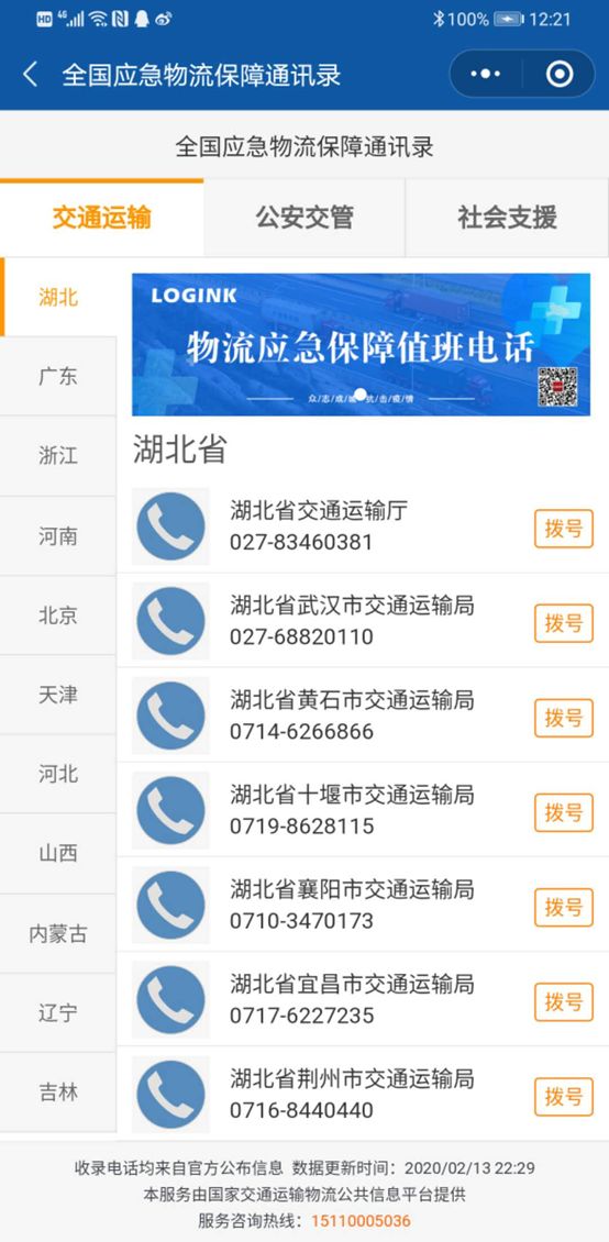 为及时受理和解决应急物资运输车辆通行中的相关问题,各地公布了24小时应急运输保障电话,国务院客户端小程序上线了交通运输部国家交通运输物流公共信息平台的全国应急物流保障通讯录服务,避免运输应急物资被设卡拦截。