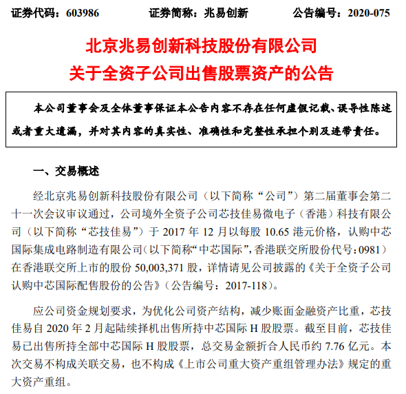 6月29日,A股上市公司兆易创新发布公告称,应公司资金规划要求,为优化公司资产结构,减少账面金融资产比重,全资子公司芯技佳易自2020年2月起陆续择机出售所持中芯国际H股(0981.HK)股票。截至目前,芯技佳易已出售所持全部中芯国际H股股票,总交易金额折合人民币约7.76亿元。