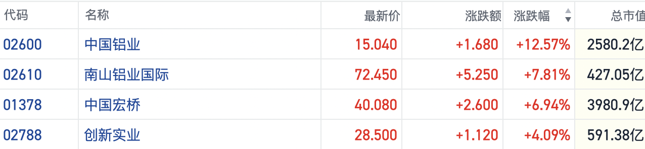 截至发稿,中国铝业(02600.HK)涨超12%,股价复权后创下自2008年二季度以来新高。南山铝业国际(02610.HK)涨约8%,中国宏桥(01378.HK)涨近7%。