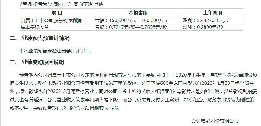7月14日晚间,万达电影发布业绩预告称,上半年预计亏损15亿至16亿元,上年同期盈利5.24亿元。对于业绩下滑的原因,万达电影表示,主要因公司下属600余家国内影城自1月23日起全部停业,境外影城也自3月底暂停营业。同时公司主投主控的《唐人街探案3》等影片未能如期上映。