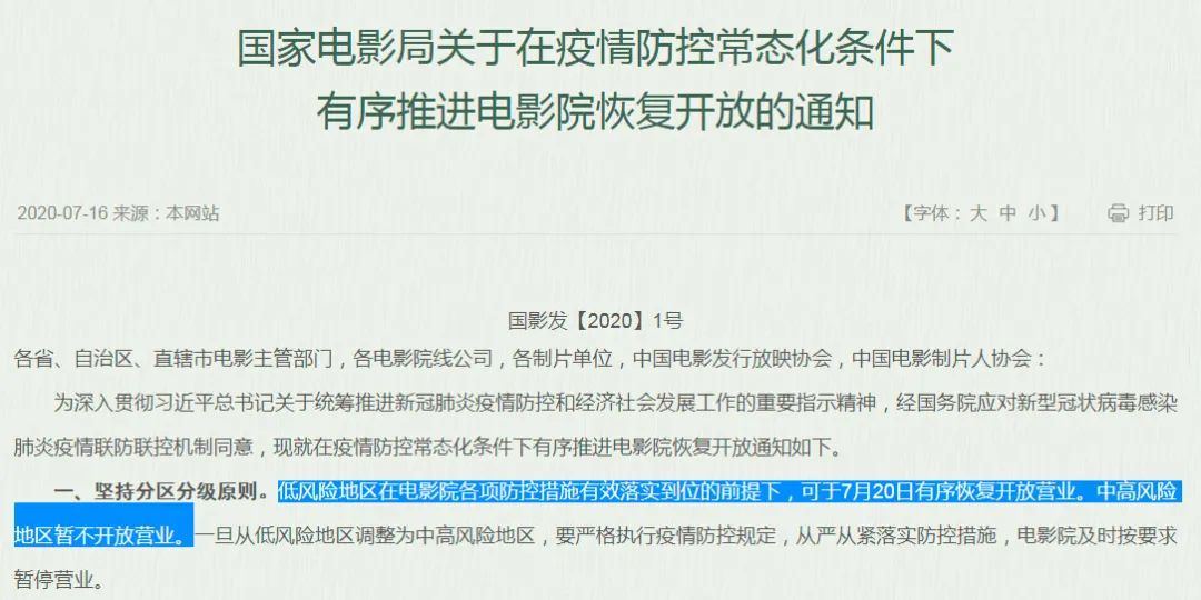 国家电影局7月16日下发《关于在疫情防控常态化条件下有序推进电影院恢复开放的通知》,低风险地区在电影院各项防控措施有效落实到位的前提下,可于7月20日有序恢复开放营业。中高风险地区暂不开放营业。