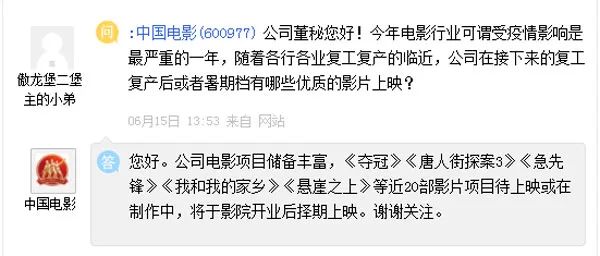 中国电影、上海电影等影视上市公司则表示,“一定做好准备。”早在今年6月,中国电影在上证e互动上回复投资者时表示:“公司电影项目储备丰富,《夺冠》《唐人街探案3》《急先锋》《我和我的家乡》《悬崖之上》等近20部影片项目待上映或在制作中,将于影院开业后择期上映。”、