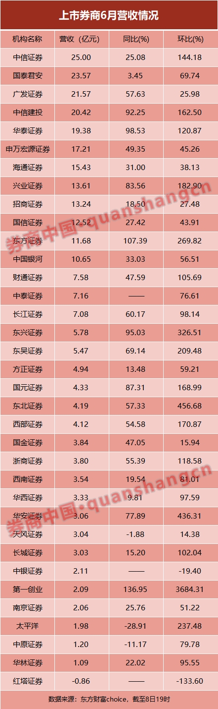 6月营收:33家券商环比正增长,16家券商翻番