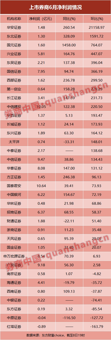 各券商6月净利润环比表现来看,35家已披露数据券商中,有28家单月净利润实现正增长,其中17家环比翻番,华安证券1.48亿元的单月净利润环比增幅超过211倍(5月份净利润为0.01亿元),东北证券1.3亿元净利润环比增幅超过15倍。