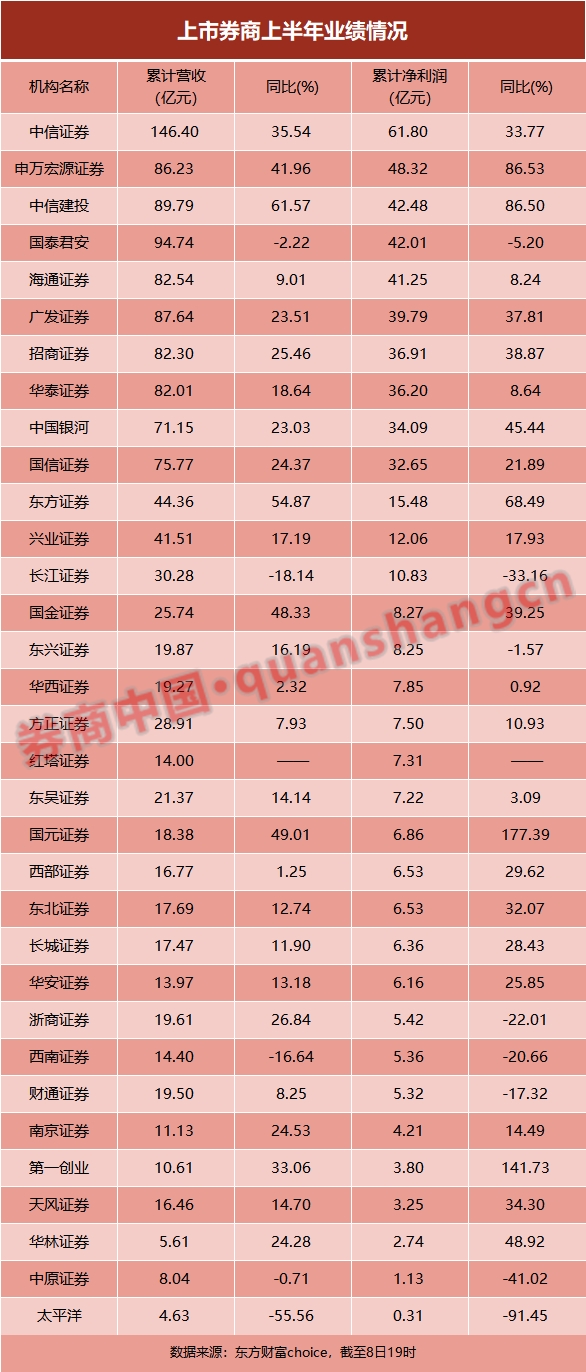 随着6月月报出炉,上市券商上半年业绩浮出水面,公布当期数据的33家券商中,有13家券商净利润超10亿元,中信证券以61.8亿元的净利润位居第一,同比增幅33.77%。需要注意的是,未经特别说明,文内均为母公司数据。