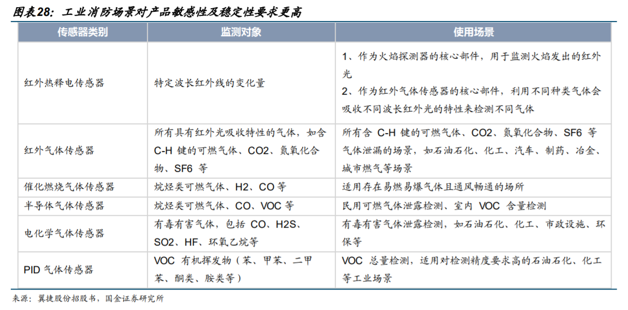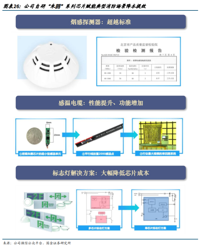 以石油化工园区工业/行业消防解决方案为例,公司从气体探测(总线、专线、无线)、工业火灾探测报警及防爆、高防护消防应急照明和疏散指示系统等方向提供工业级整体解决方案,仅探测器与报警装置就涉及10项核心产品,核心器件传感器及芯片均由公司自主研发。