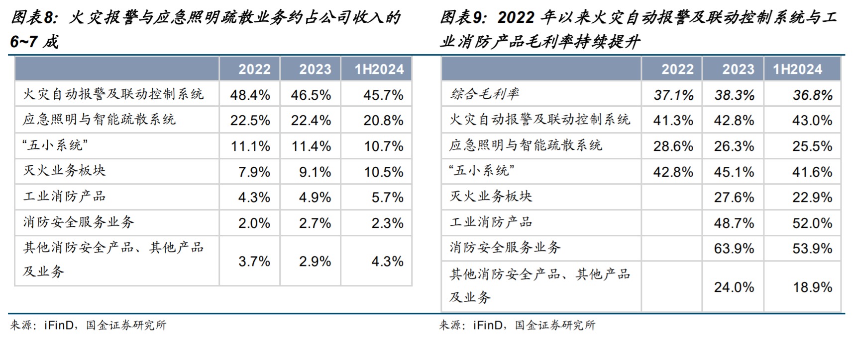 分产品结构看,公司火灾报警与疏散业务收入比重较高且毛利水平有一定支撑,新兴业务工业消防收入比重持续提升,且毛利率水平显著高于其他业务。