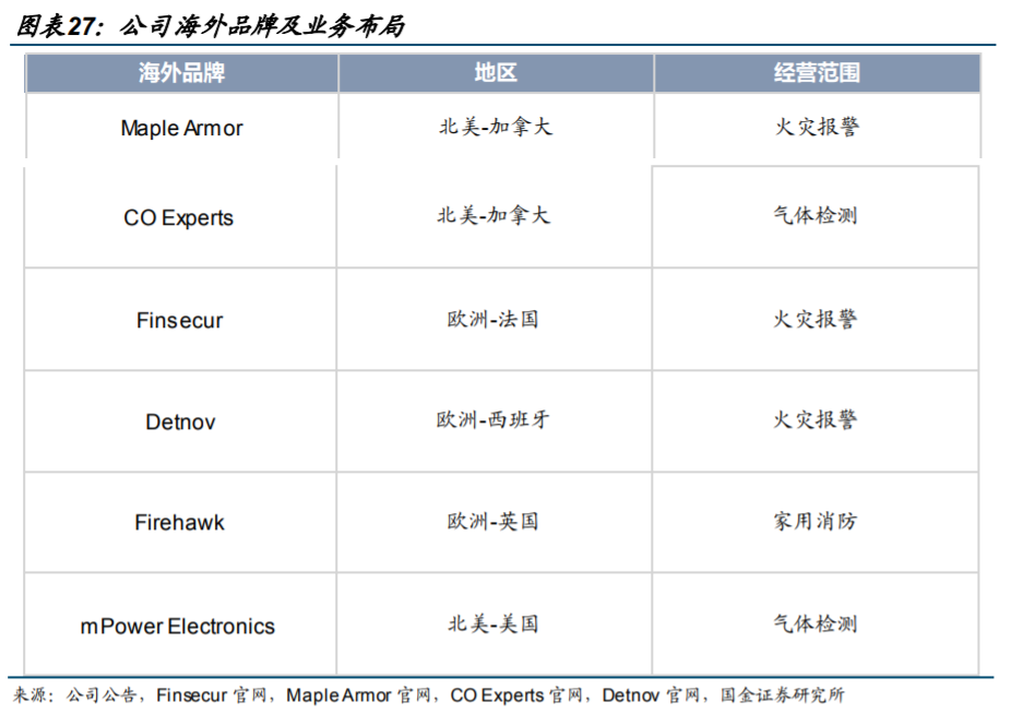 1)出海:公司目前已初步在欧洲北美形成消防报警品牌矩阵,24上半年出海业务占比16.5%,同比增长24.7%,未来有望向不同区域加快新品类导入进程,提升产出。2024 上半年,公司收购 FB 集团,通过英国“Firehawk”品牌、加拿大 COExperts 品牌积极开拓英国、欧盟、北美、大洋洲、中东地区等海外家用消防市场,把握进入 C 端独立式探测器市场(包括感烟、感温、燃气、有毒气体等各种类型)机遇。
