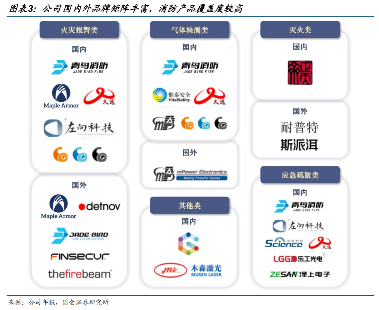 消防产品属于低容错安全防护行业,存在较高的产品准入资质与认证门槛,因此通过市场并购方式获取细分产品能力或为最优解。公司在此背景下通过外延并购的方式拓展产品品类,逐渐补齐了涵盖火灾报警、气体检测、灭火、应急疏散等在内的消防品类矩阵,为其后续拓展工业消防打下产品端的坚实基础。