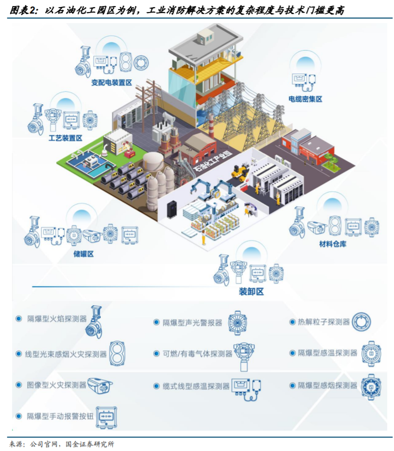 工业/行业消防存在国产替代机会,解决方案复杂度与技术门槛更高。工业/行业消防的主要应用领域集中在石化、钢铁、冶金、电力、储能、通信设备及中高端制造等行业,与传统民商用消防相比,其产品和解决方案的复杂程度、技术门槛更高。工业/行业消防项目除了配置消防产品与设施外,还需要根据区域的不同设置相应的保护设施和防火等级,配置不同的消防保护设备。近年来,随着国内消防产品厂商资金、技术实力的增长,工业/行业消防的国产替代机会将逐步显现。