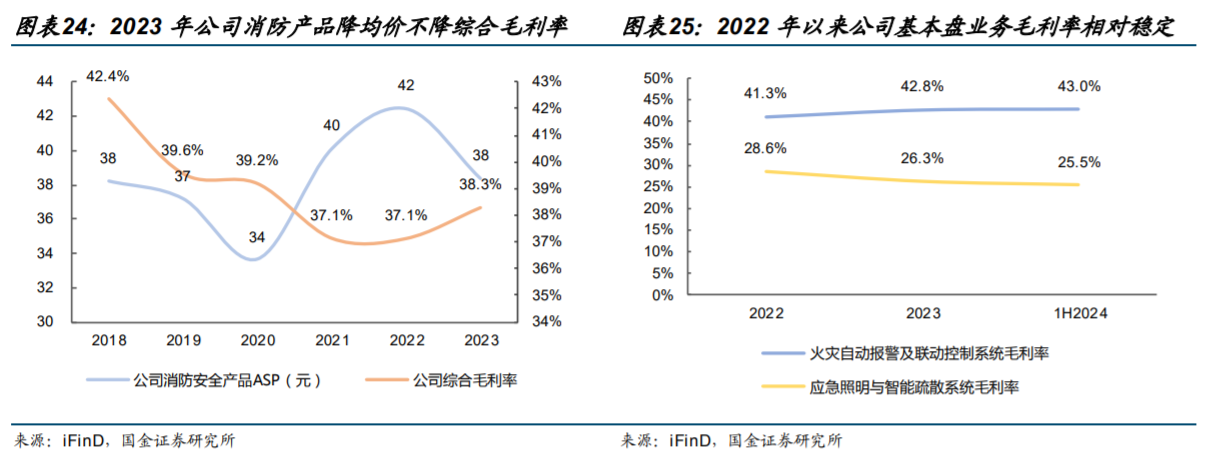 底盘稳:“增量建设”转向“存量更新”,基本盘业务降均价不降毛利率。公司经营韧性较强,需求侧,存量住宅更新有望托底需求筑底修复;供给侧,公司自研“朱鹮”芯片在行业弱景气背景下保障降均价不降毛利率,火灾报警业务22/23/1H24毛利率分别为41.3%/42.8%/43.0%。