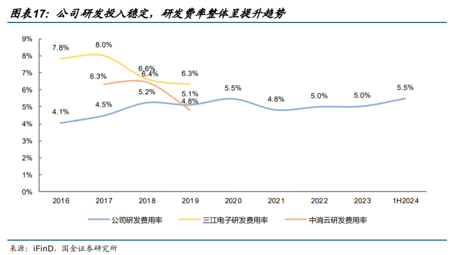 增量足:出海业务具备扩品类空间,工业/行业消防向多行业拓展。1)出海:公司目前已初步在欧洲北美形成消防报警品牌矩阵,24上半年出海业务占比16.5%,同比增长24.7%,未来有望向不同区域加快新品类导入进程,提升产出。2)工业/行业消防:对产品敏感性、稳定性及方案复杂度要求更高,过往主要由海外厂商主导,近年来国产替代与新兴需求共振,公司已在化工、轨交、电力等行业布局。