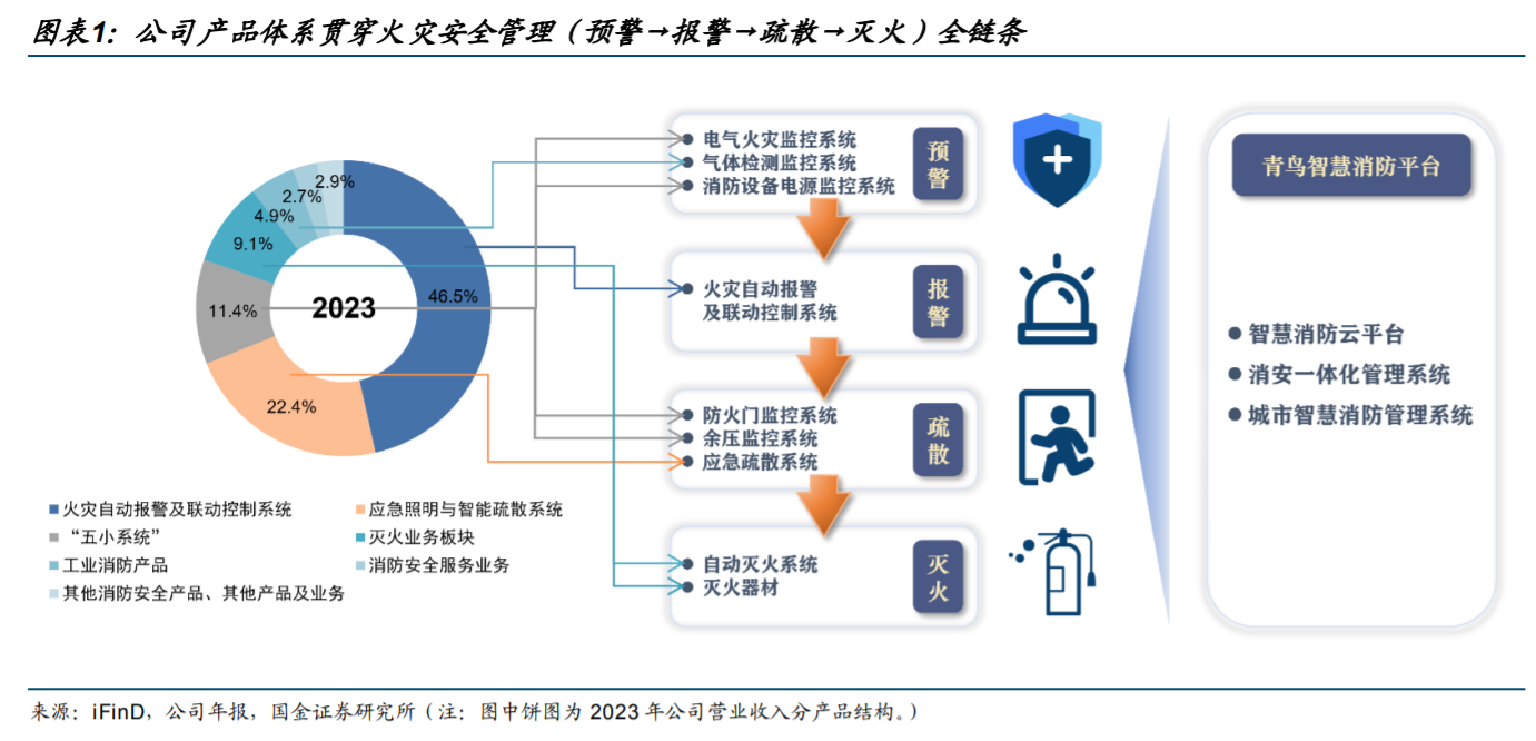 公司是国内消防报警行业龙头,业务覆盖消防报警、气体灭火、气体检测、应急照明与疏散、工业消防等领域,目前产品体系涵盖预警>报警>疏散>灭火全链条。