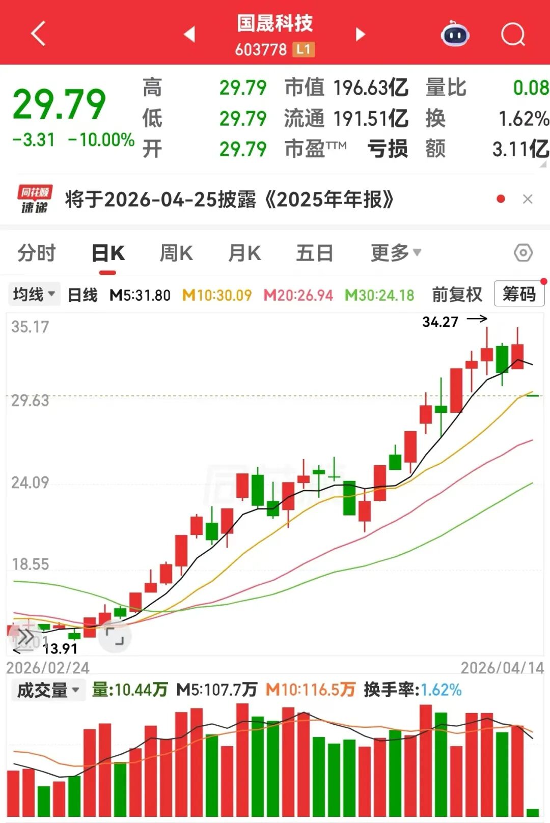 在此消息影响下,该股今天(4月14日)全天一字跌停。截至收盘,国晟科技报29.79元/股,下跌10%,跌停板上封单超过71万手。