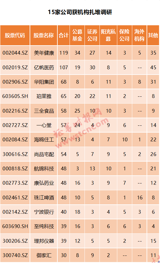iFinD数据显示,个股方面,美年健康累计接待机构达119家,位居首位;亿帆医药、华阳集团分累计接待107家、68家机构,分别排名第二、第三位。
