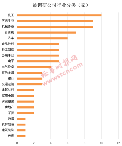 按行业分类看,上周被调研公司中,化工行业被调研的公司数量位居首位,共有10家,医药生物和机械设备行业被调研企业数量并列第二,均有9家公司获机构调研。