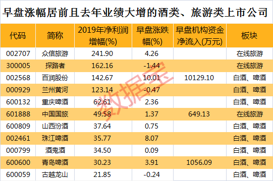 其中,今日大涨的众信旅游2019年净利润同比增长近2.5倍。探路者、百润股份等3股2019 年净利润同比增幅均超过100%。其中百润股份、酒鬼酒在一季度极端市场环境下净利润仍然实现增长,同比增幅均超过30%。