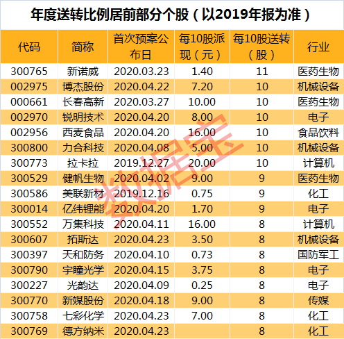 年报披露接近尾声,业绩优质的公司对投资者也十分慷慨。证券时报•数据宝统计显示,截至4月24日,1530家公司披露了2019年度分配方案,其中分配方案中包含送转的公司有246家。送转方案来看,目前每10股送转比例最高的是新诺威,公司拟10送转11股;博杰股份、长春高新等紧随其后,送转比例为每10股送转10股、10股。按照高送转最新要求,共有8家公司的分配方案包含高送转,其中,中小板公司有3家,创业板公司有3家。