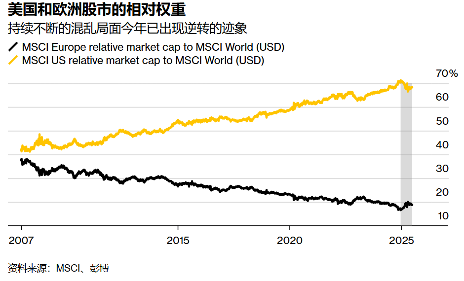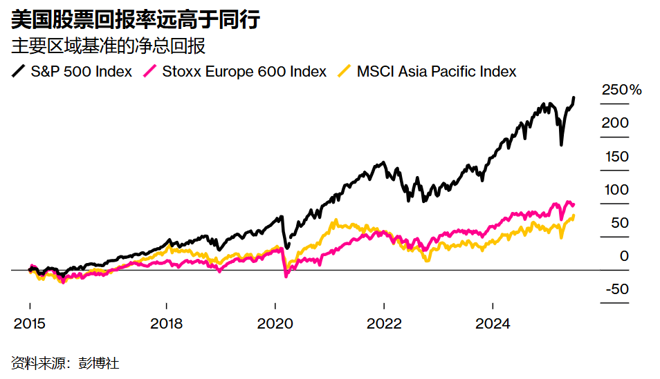 数据印证着这种特殊性:根据统计,美国债券市场总规模达29万亿美元,占全球固收类资产的40%;美股65万亿美元的总市值更占全球股市半壁江山,且在MSCI全球指数中的权重从2008年金融危机后的不足50%攀升至近70%。过去十年,美国企业盈利增长远超其他区域,标普500成分股每股收益翻倍,是欧洲斯托克600指数增幅的两倍,股票回购机制更强化了股东回报优势。