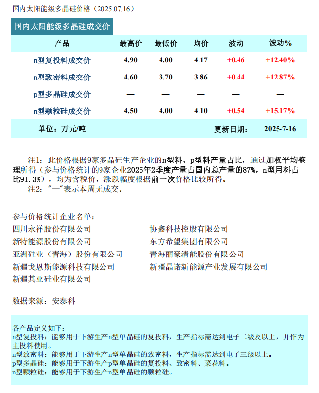 硅业分会发文称,本周多晶硅n型复投料成交价格区间为4.0-4.9万元/吨,成交均价为4.17万元/吨,周环比上涨12.4%。n型颗粒硅成交价格区间为4.0-4.5万元/吨,成交均价为4.10万元/吨,周环比上涨15.2%。