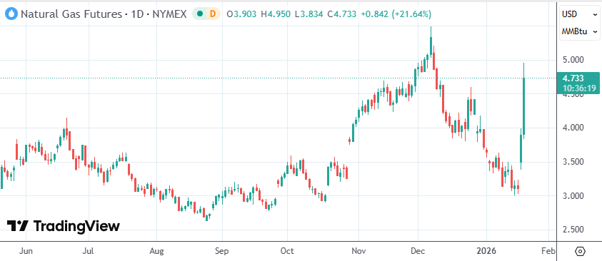 随着大范围严寒天气席卷美国、取暖需求激增,美国天然气期货价格在两天内已经累计上涨超过50%。