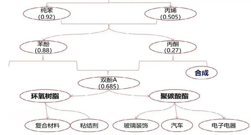 丙酮的下游化工品主要有双酚A(为环氧树脂及PC等主要原料)、异丙醇(为制药、化妆品原料)、MMA(即甲基丙烯酸甲酯,是有机玻璃、涂料、信息材料等产品的原料)等三种。