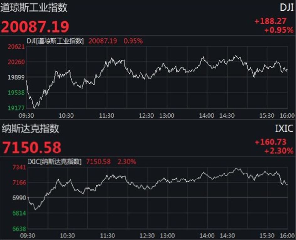 美东时间周四,美股集体收涨。三大股指开盘后走势反复,道指宽幅震荡,振幅超过1200点。截至收盘,道指涨0.95%,报20087.19点;纳指涨2.30%,报7150.58点;标普500指数涨0.47%,报2409.39点。