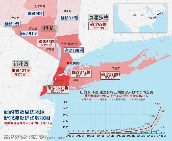据央视新闻消息,当地时间3月19日下午,纽约市长德布拉西奥称,全美最大城市纽约确诊新冠肺炎人数从数小时前的不到2500例飙升近5成,达到了3615例,死亡人数达到22人。