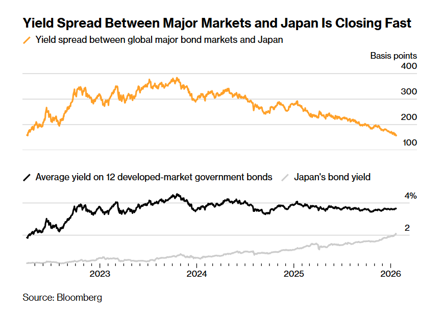 这背后的逻辑,无疑在于全球主要市场与日本国债市场之间的收益率差距正在快速缩小。