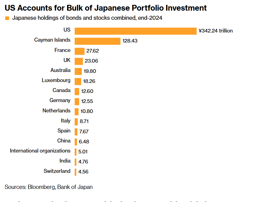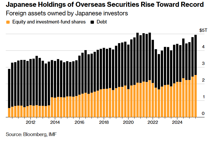 如上图所示,日本各大投资机构在海外市场的累计证券持有量攀升至创纪录水平——外国资产占日本投资者持有量的比例近年来迅速攀升。