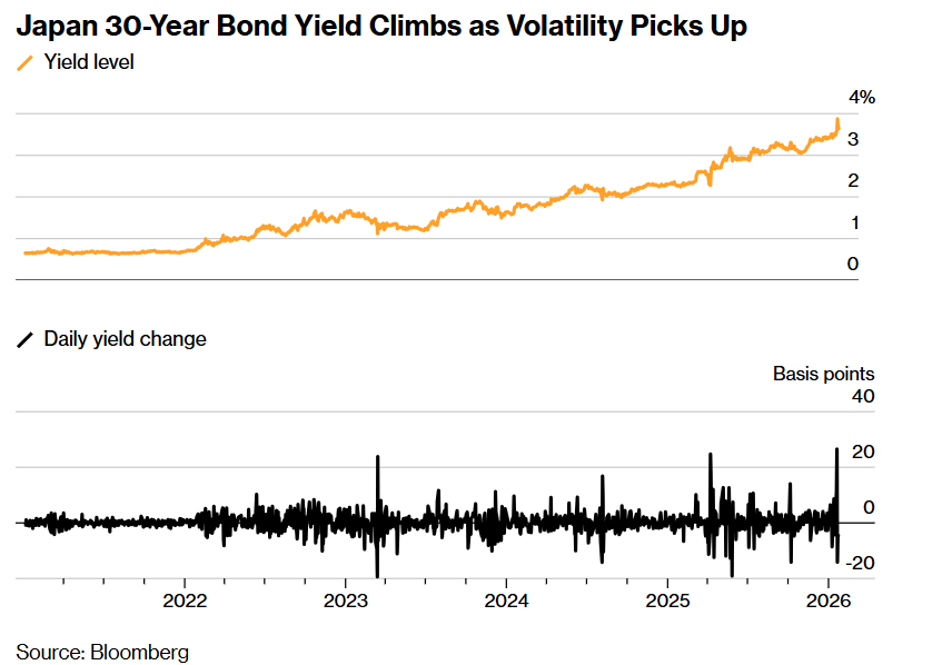 即便以这些标准来看,上周二的大规模抛售仍然显得格外突出。由于高市早苗宣布开启众议院选举,旨在巩固自己所在政党的权力,并确保她的高支出和减税计划获得日本国会更多席位支持,超长期债券的收益率突破了4%的历史最高位,30年期日本国债收益率甚至上涨了超过四分之一——是过去五年日均波动幅度的足足八倍。