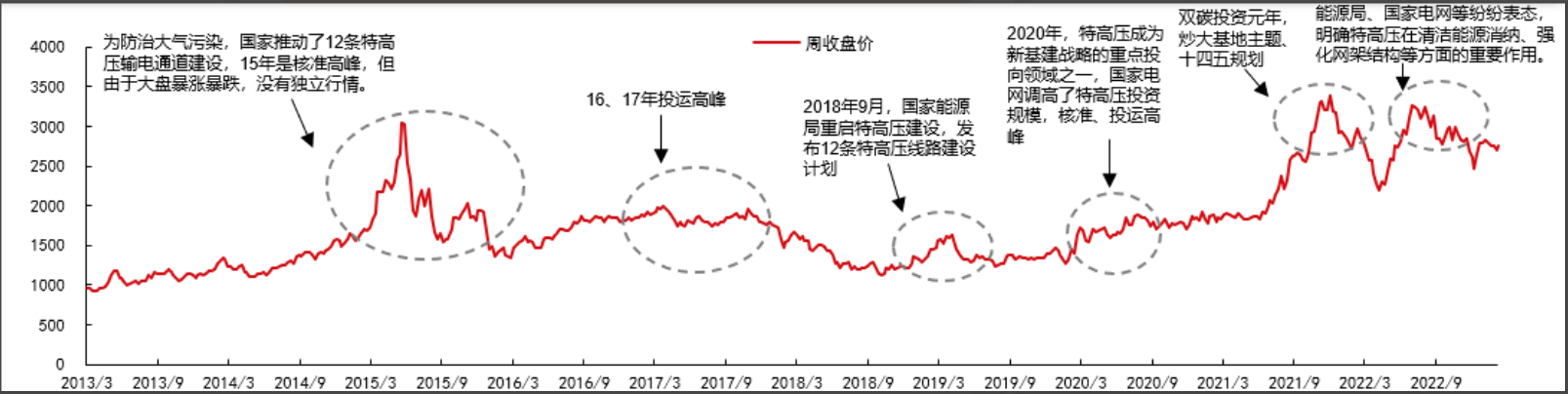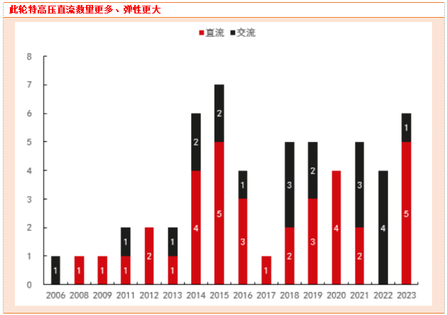 本轮周期由新能源大基地送出需求所驱动,但本质上也是逆周期调节经济的重要手段。技术上柔性直流等技术有望得到更多应用,项目造价也有所提高。2023年会出现核准、招标、开工高峰,我们初步判断由于新能源送出需求较强,后续可能仍然有新的项目进入规划(以直流为主)。但本质上本轮周期主要是调节经济+新能源外送共同驱动,我们认为2023年出现开工招标高峰,2024-2025年出现业绩高峰。