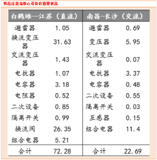 特高压直流线路核心设备价值量更高,看好换流变和换流阀环节。以白鹤滩-江苏和南昌-长沙两条近来投运的线路为例,经统计,直流线路的核心设备价值量在70亿元左右,而交流线路的核心设备价值量只在20亿元左右。从各环节的价值量分布来看,直流线路中占比较高的为换流变压器、换流阀、组合电器、电容器等,市场份额集中度较高,基本被4-5家企业占据。