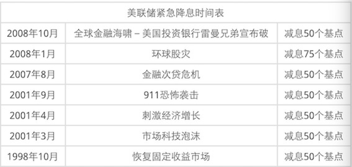 回顾美联储过去的几次紧急降息,分别是1998年10月,俄罗斯主权债券违约导致LTCM(长期资本投资管理公司)爆仓而引发美国系统性危机;2001年3月,互联网泡沫崩溃;2001年4月,刺激经济增长;2001年9月,911恐怖袭击;2007年8月,次贷危机爆发;2008年1月,全球金融市场暴跌;2008年10月,雷曼兄弟破产引发全球金融海啸。每一次都是严重的经济衰退和金融危机,而此次截然不同。