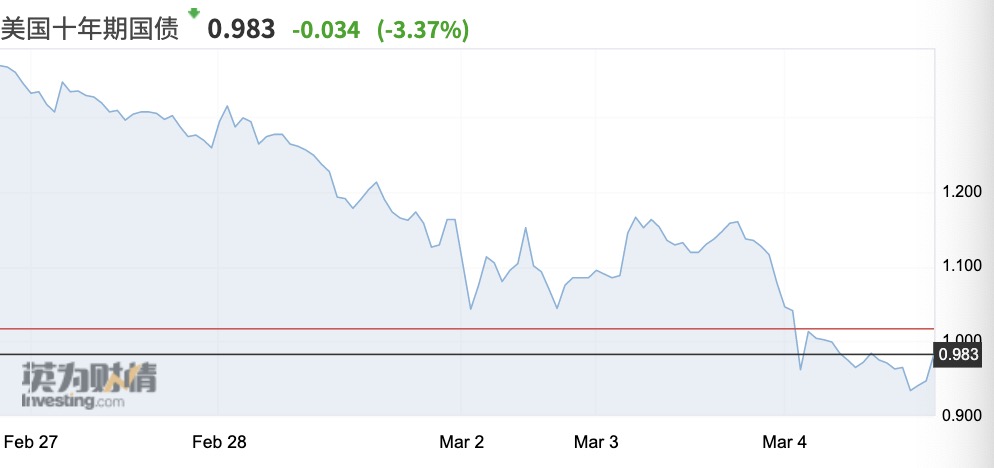 在美联储降息的带动下,3月4日,美国10年期债券收益率则跌至0.95%附近,而中国10年期国债大涨,收益率进一步下行至约2.75%的近四年新低,
