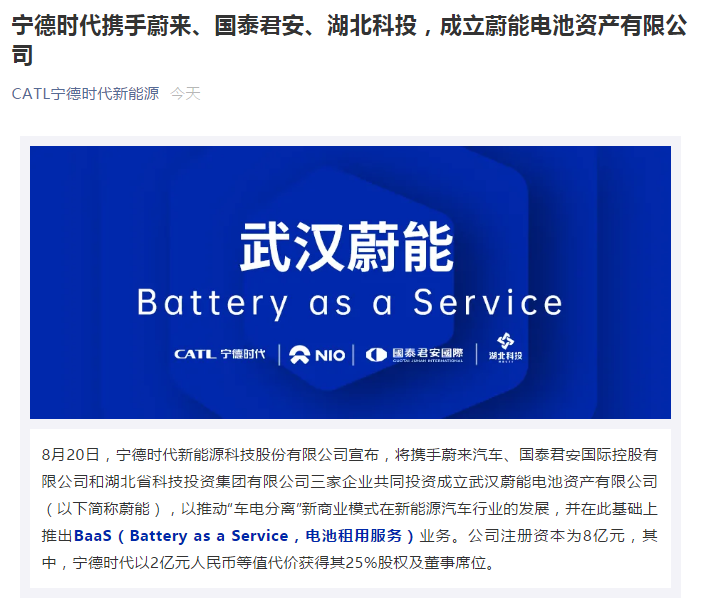 宁德时代8月20日宣布,将携手蔚来汽车、国泰君安国际和湖北省科投,共同投资成立武汉蔚能,旨在促进“车电分离”新商业模式在新能源汽车行业的发展,并在此基础上推出BaaS业务。