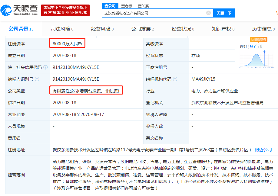 天眼查数据显示,武汉蔚能注册资本为8亿元,是一家包含港澳台投资的有限责任公司。其四家股东分别是宁德时代新能源科技股份有限公司、蔚来(安徽)控股有限公司、国泰君安金融产品有限公司以及湖北省科技投资集团有限公司,但并未公布具体持股比例。