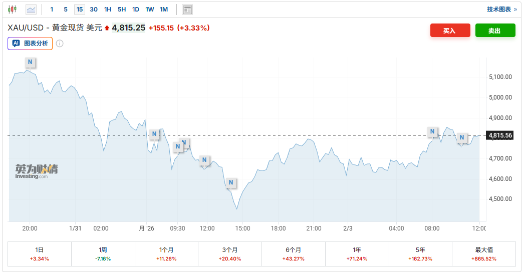 截至发稿,黄金现货涨超3%,重新站上4800美元/盎司。