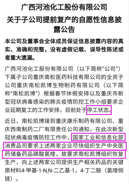 2020年2月4日,*ST河化披露了《关于子公司提前复产的自愿性信息披露公告》。公告称,其目前处于停工状态的全资子公司南松凯博,近日接到重庆康乐制药、重庆西南制药二厂通知,在此次新型冠状病毒疫情防控工作中,国家工信部消费品司要求上述两家企业尽快组织生产中央医药储备药品磷酸氯喹,故要求南松凯博组织恢复生产。