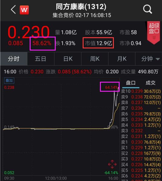 截止收盘,同方康泰上涨58.62%,总市值12.9亿港元,较前一交易日上涨4.5亿港元。