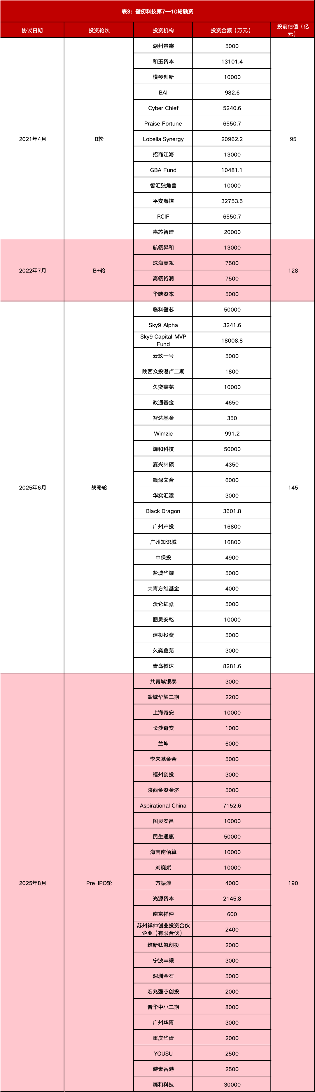 以3亿元投资额为界,壁仞科技后续融资中的重仓机构包括熵和科技、临港科创投、民生人寿、中国平安,投资额分别为8亿元、5亿元、5亿元、3.3亿元。