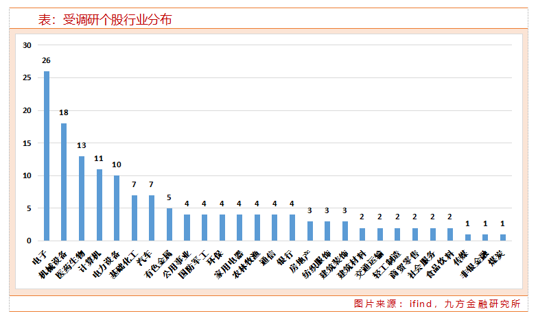 从行业分布来看,本期电子行业调研量高居首位,有26家上市公司接受调研;随后为机械设备行业,有18家上市公司接受调研。