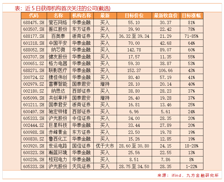 最新机构首次关注股票方面,近5日共有67份研报对上市公司进行首次覆盖,其中,22家获得明确的目标价格。