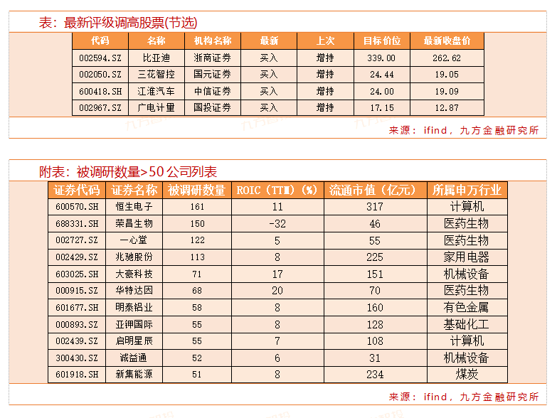 近5日有24家公司获得券商调高评级,比亚迪、三花智控、江淮汽车、广电计量获证券给出明确目标价格。